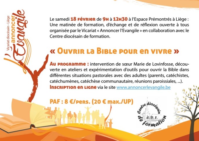 Le Service diocésain de la catéchèse en collaboration avec le Centre diocésain de formation est heureux de vous inviter à une matinée de formation, d’échange et de réflexion le samedi 18 février 2023 de 9h à 12h30 à l’Espace Prémontrés à Liège : Ouvrir la Bible pour en vivre.