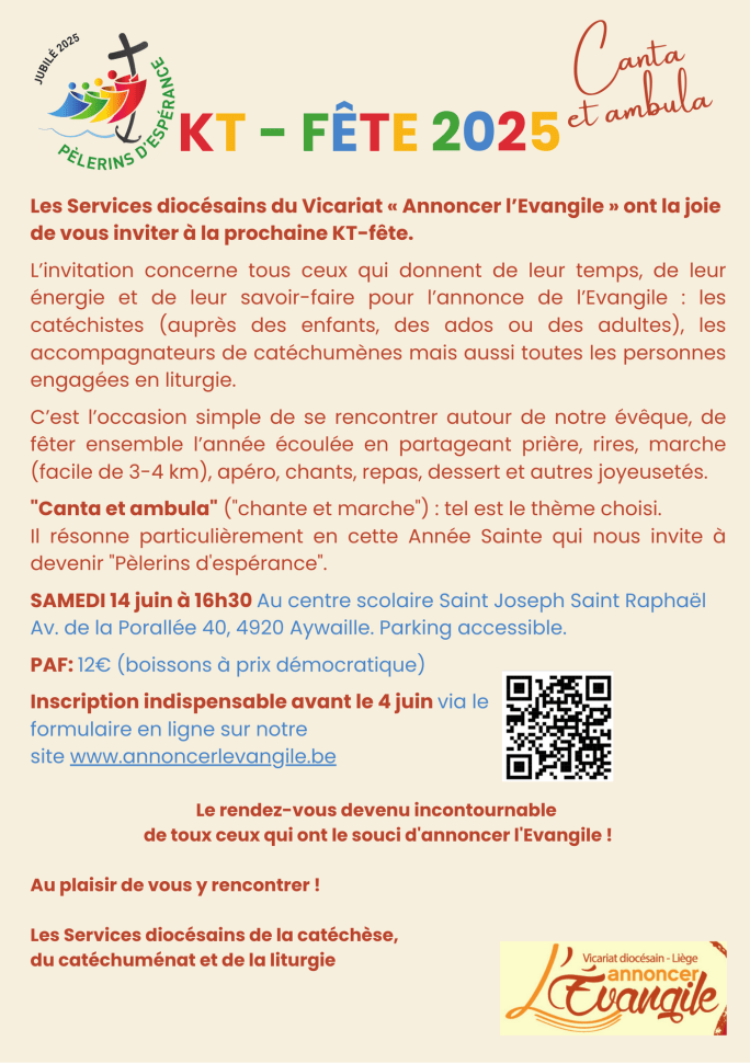 Les Services diocésains du Vicariat « Annoncer l’Evangile » ont la joie de vous inviter à la prochaine KT-fête : le rendez-vous devenu incontournable de toux ceux qui ont le souci d’annoncer l’Evangile !