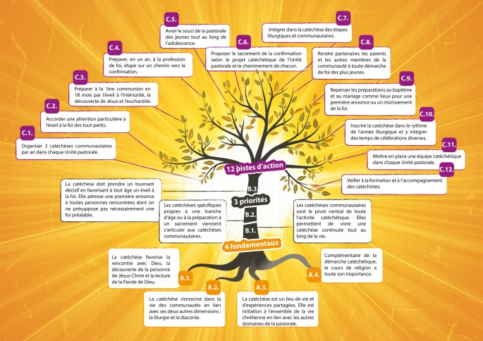 Arbre évolutif en pdf présentant les 4 fondamentaux, les 3 priorités et les 12 pistes d’action pour une catéchèse renouvelée.